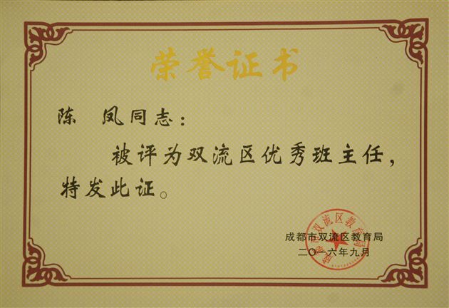 2016年教师节,双流区教育局表彰了一批优秀教师,附小陈凤老师、廖凤老师被评为双流区优秀班主任。