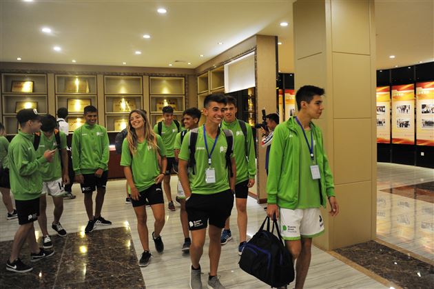 阿根廷足球代表团刚进学校大门,就受到我校师生的热烈欢迎,学校常务副校长王天贵、政务副校长温元聪、副校长朱晓波、附小校长苏萍、校长助理黄波、学校党总支副书记付全中、体卫艺处主任何北参加了欢迎仪式。王校长代表学校向阿根廷代表团赠送了由六种书体书写的“龙”的书法纪念品,而阿根廷足球代表团领导也向学校赠送了阿根廷足球巨星梅西签名的阿根廷国家队球衣。