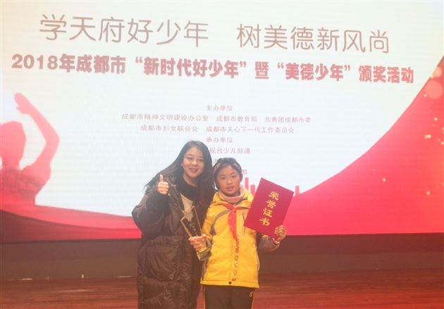 2018年12月27日,由成都市文明办、市教育局、团市委、市妇联、市关工委主办的2018成都市“新时代好少年”暨“美德少年”颁奖活动在高新区教育发展中心举行。来自我校小学五年级六班的宋慧乔同学荣获成都市第九届 “爱心美德少年”称号,并在区文明办黄剑伟老师、棠外小学部德育处副主任郭飞老师的带领下参加了颁奖仪式。