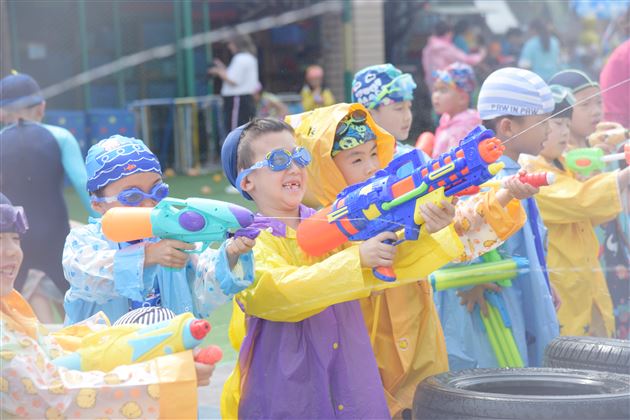 喜欢水、爱玩水是孩子的天性,此次六一儿童节,幼儿园特意把户外操场变成了“水上乐园”,让孩子们尽情地和水来一次亲密接触。恐龙充气城堡、水上超级滑梯、欢乐海洋球、海绵炸弹、水杯接力、水枪大战、泡泡秀,孩子们与同伴、老师一起尽情打闹、尽情嬉戏、尽情玩耍,幼儿园到处充满了孩子们的欢声笑语,仿佛空气中都弥漫着节日欢乐的味道!