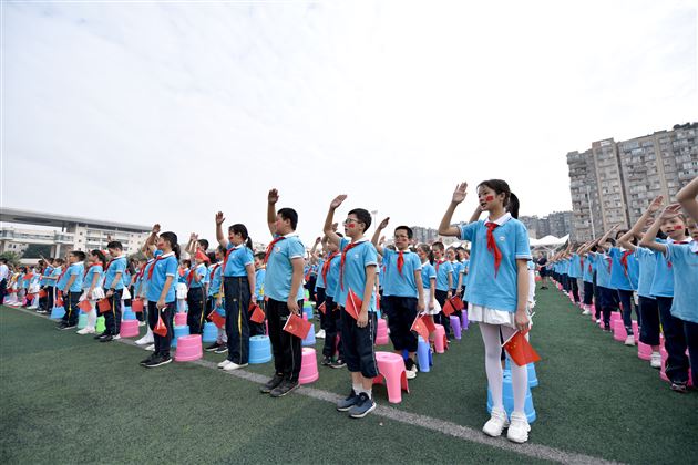 附小全体学生同唱祖国颂歌把活动推向高潮,一年级学生稚嫩的《国旗国旗真美丽》、二年级学生高昂的《红星歌》、三年级学生热烈的《祖国,祖国我们爱你》、四年级学生悠扬的《采一束鲜花》、五年级学生舒缓的《雨花石》、六年级学生的深情的《今天是你的生日》,都彰显着少先队员们对祖国浓烈的情感和真挚的爱。最后全校师生齐唱《我和我的祖国》,更是渲染了节日的氛围,凸显了爱国的情怀。