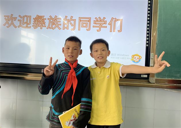 博洛乡中心校师生来到了四年级十班教室,四年级十班的同学们用热烈的掌声欢迎客人的到来。博洛乡中心校的4位同学做了自我介绍,并与四年级十班同学交上朋友。他们教附小的同学们说彝族语言,告诉附小同学们他们一天的生活。当听说他们每天六点起床还要割猪草、喂猪、做早餐时,四年级十班的孩子们感叹不已,十分敬佩。最后,四年级十班的同学们给博洛乡孩子们赠送了书籍,并合影留念。