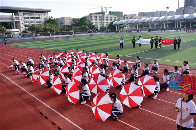 开幕式上,旗手们踏着铿锵有力的步伐护着庄严的国旗和五环旗率先入场,紧随其后的是意气风发、气宇轩昂的标语方队,分别举着“开放、民主、求实、创新”“更快、更高、更强、更团结”“仁、德、志、譞 ” 的巨幅标语牌精神抖擞地迈过主席台,展示了学校先进的办学理念和我们崇尚的奥运精神。彩旗方队紧跟其后。
