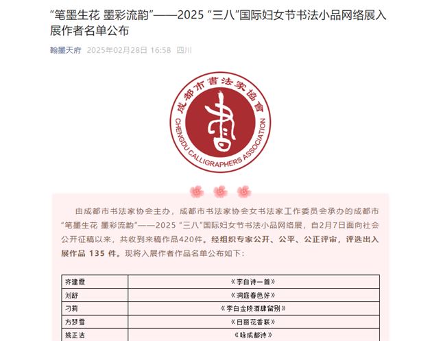由成都市书法家协会主办,成都市书法家协会女书法家工作委员会承办的成都市“笔墨生花 墨彩流韵”——2025 “三八”国际妇女节书法小品网络展,自2月7日面向社会公开征稿以来,共收到来稿作品420件。经组织专家公开、公平、公正评审,评选出入展作品 135 件。其中,我校初中郭彦老师的作品《成都是一座来了就不想走的城》入选展览。