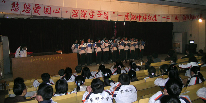 昨天(2004年12月9日)下午,棠湖中学本部第一阶梯教室内座无虚席,气氛庄严而又热烈,来自初一、初二的师生们度过了一个难忘的下午!棠湖中学纪念“一二·九”爱国运动六十九周年活动——“悠悠爱国心,深深学子情”诗歌朗诵比赛在此隆重举行!