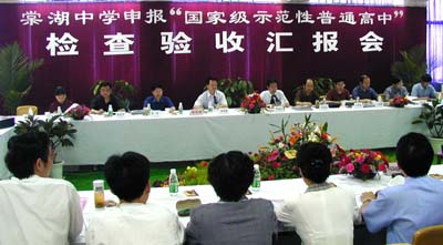 此前,棠湖中学已于2000年12月26—27日接受并通过了由成都市教委组织的“国家级示范性高中”初查评估。学校在近10年办学过程中超常规、跨越式发展的成绩,受到初评专家组的充分肯定和高度评价。2001年4月16—17日,省教育厅有关领导来校就省教育厅正式检查验收事宜进行了调研。5月9日,省教育厅正式行文,决定于5月14—16日对棠湖中学进行“国家级示范性高中”评估验收。