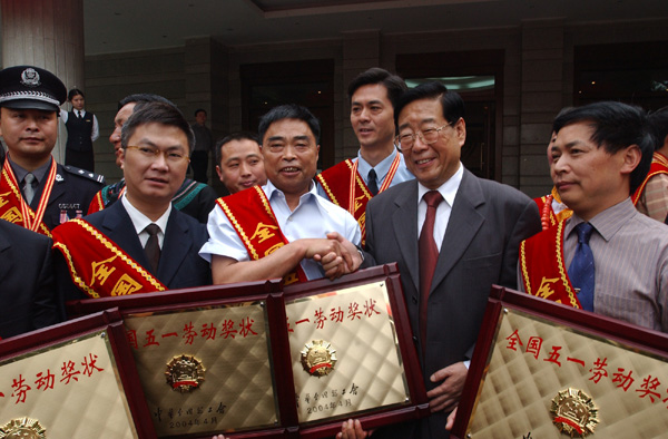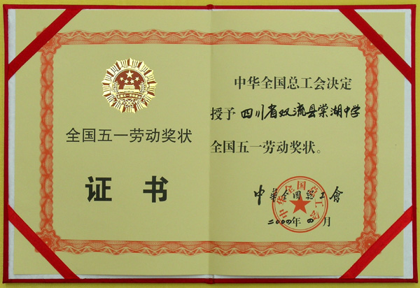 棠湖中学荣获"全国五一劳动奖状"殊荣,颁奖仪式2004年4月29日上午在金牛宾馆举行。中共四川省省委书记张学忠为棠湖中学校长黄光成授牌和颁发证书。