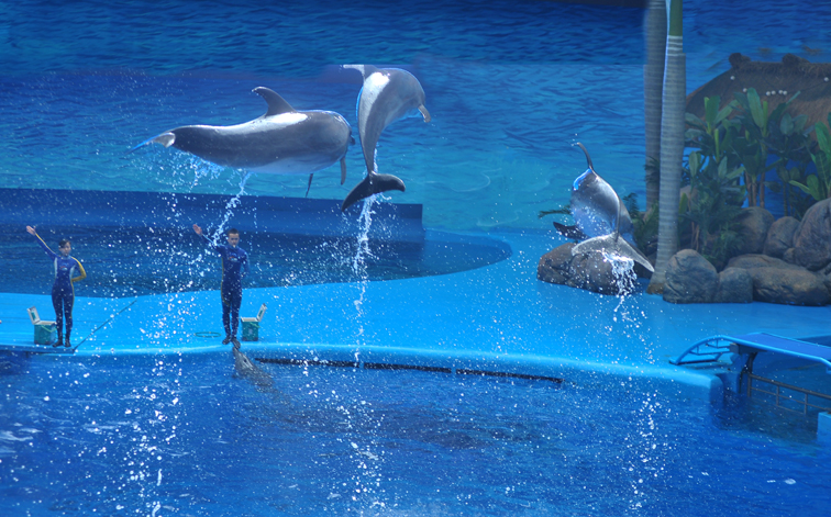 11点正,由大厅底层观鲸豚后步约六层阶梯,看海豚表演。鲸豚之大,百米之房不能装载;海豚之敏,千万物种难以比试。海豚在水中,如箭离弦,快如飞,却又能转动自在;跃出水面,体如弓,高丈许,划出漂亮的弧线。与人同欢,鼓掌,呼叫,敬礼,全出自动物被驯化后的得体表达。点头,摇头,要与不要,类小孩的天真而又不失动物求食的本能。海豚表演仅20来分钟,把游人的热情带至高潮。