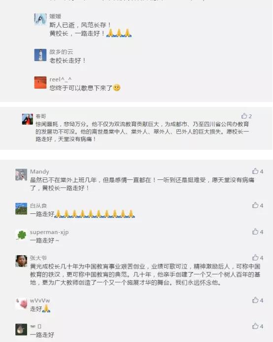 @倔强的萝卜:“我90年上的双流中学高中部,那时候双流只有双中,彭中,华阳中学,中和中学,籍田中学几所普通高中,同学有机投金花,金桥,华阳等镇的。是你这样一位民办教育的开拓者创办了棠中,91年开始招生让更多的人有了继续读书的机会,也为双流成为教育百强县立下了赫赫战功。我的孩子有幸在棠外读高中,今年高考毕业的,她就读的班高考成绩班平636!谢谢你这样一位全身心投入到教育中的老人,一路走好。”
